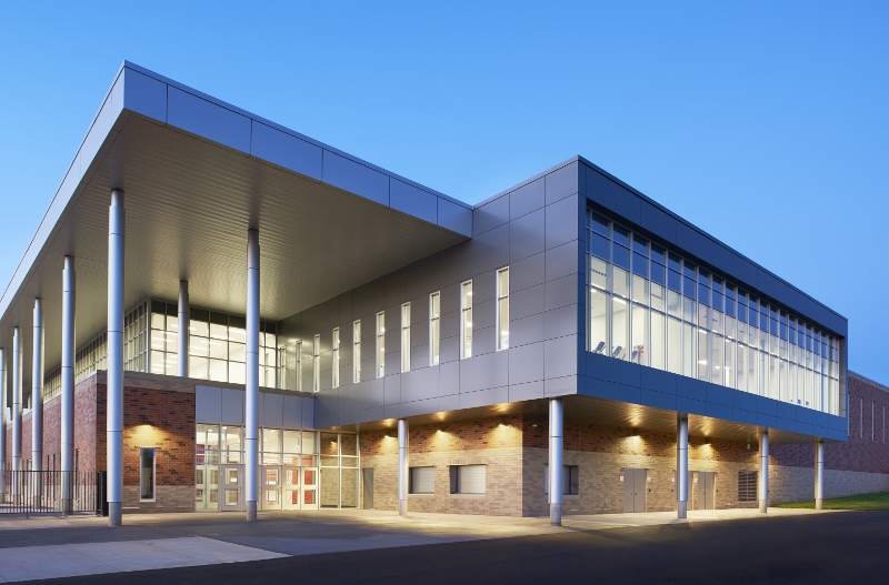 - Activity center roof utilized steel joists and metal deck system to span large gymnasium spaces, while classroom additions incorporated precast concrete roofs to provide required fire ratings and additional safety.