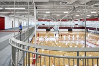 - Elevated running track in the gymnasium constructed using composite concrete over metal deck, suspended from the roof structure above to optimize open space and visibility.
