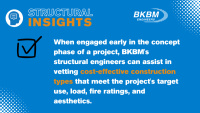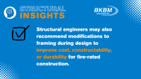Structural engineers must evaluate the materials and framing methods used in the building and verify they meet the load-carrying requirements while maintaining fire ratings for the chosen construction type. When engaged early in the concept phase of a project, structural engineers can assist in vetting out cost-effective construction types that meet the project's target use, load, fire ratings, and aesthetics. Structural engineers may also recommend modifications to framing during design to improve cost, constructability, or durability for fire-rated construction.